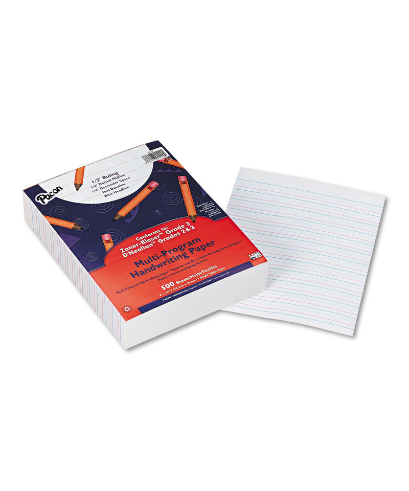 Rulings conform to Zaner-Bloser™ and/or D'Nealian™ handwriting programs. Bright tablet paper ruled on both sides with red baselines, blue dotted midlines and blue headlines.