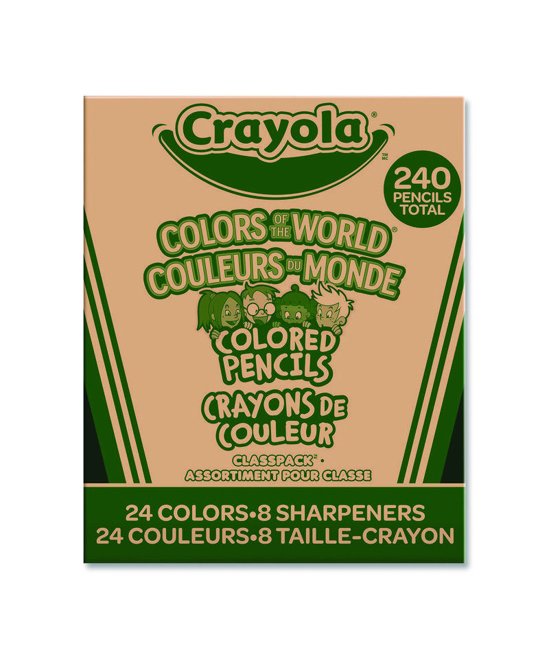 This Crayola Colors of the World Bulk Colored Pencil Set contains 240 colored pencils in 10 sets of 24 specially formulated colors and eight pencil sharpeners. These skin tone colored pencils are a welcome addition to any classroom art tools collection, allowing children to make school projects more realistic and true to their world. The subtle shades inside are formulated to better represent the growing diversity around the globe. Colors of the World fall into three main shades—Almond, Golden and Rose and all the darker or lighter shades in between. This pack includes 24 new colored pencil colors that represent people of many different regions and cultures. Makes a great addition to classrooms, art rooms, and more!