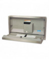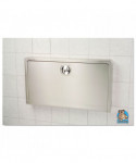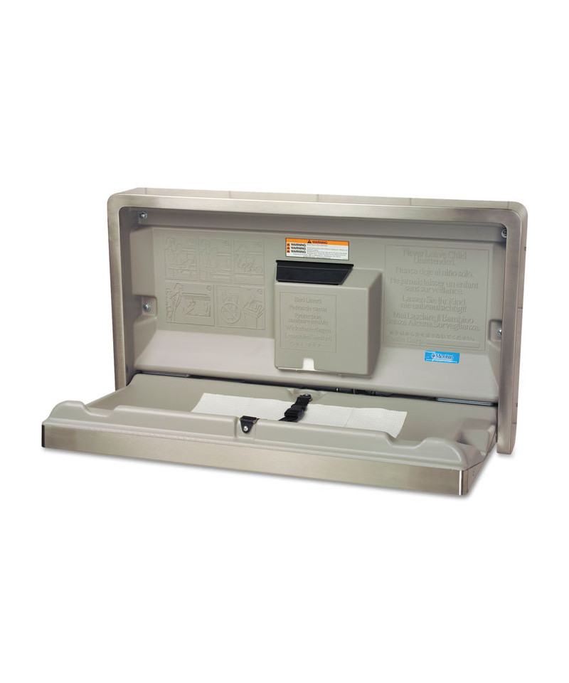 Complete your restroom with a sleek and attractive satin-finished stainless steel baby changing station. Smooth and sturdy molded-polyethylene interior safely cradles infants and toddlers while enabling easy, hassle-free cleaning. Microban antimicrobial treatment helps protect product surface from the spread of germs and bacteria. Safety belt provides rushed parents with extra peace of mind. Built-in liner dispenser adds convenience. Reinforced full-length steel-on-steel hinge mechanism ensures durability.
