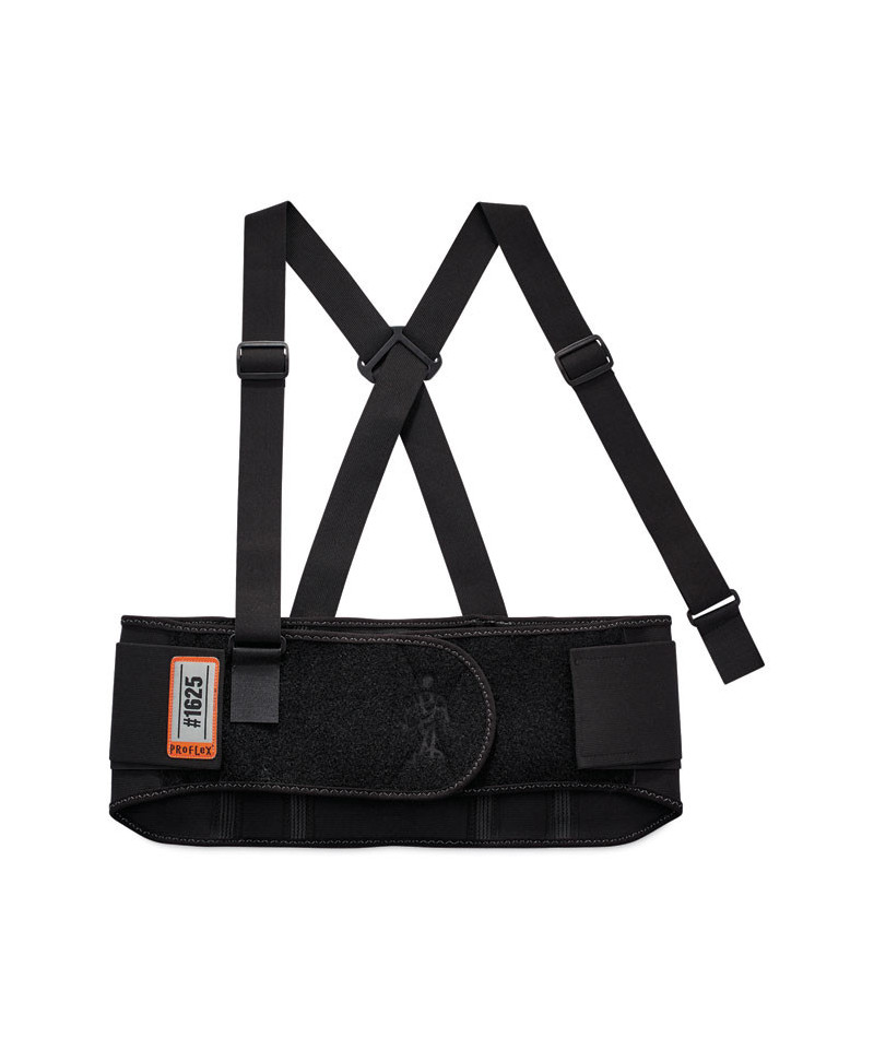 The ProFlex 1625 Standard Elastic Back Support Brace is designed to remind workers of proper lifting techniques while also enhancing the body's intra-abdominal pressure, moving the stress away from the spine for back-pain relief. Premium, all-elastic body with a 7.5 wide belt provides extra-firm support, and a contoured, high-cut front panel delivers a more comfortable fit. Before lifting heavy objects, simply tighten the support belt to enhance the body's intra-abdominal pressure; and after lifting, just loosen the belt to achieve a wider range of motion. Secure-fit, interior rubber-track webbing prevents the belt from riding up when bending or lifting. Innovative Power Panel Positioners keep the tension bands close-to-hand, making it easy to get the desired level of tension. Non-conductive polypropylene stays help ensure long-lasting integrity. Adjustable, detachable suspenders allow the wearer to tailor the shoulder-fit to his or her unique needs. For best results, the support should fit snugly around the wearer's hips, with the front of the support two-fingers below the wearer's navel. When worn correctly, workers can easily maintain the proper posture for lifting, while achieving the extra support required to safely complete the task. Easy-to-use hook-and-loop closure keeps the belt securely fastened while in use. Brace can be worn over or underneath clothing. Machine washable—machine-wash cold and air dry.