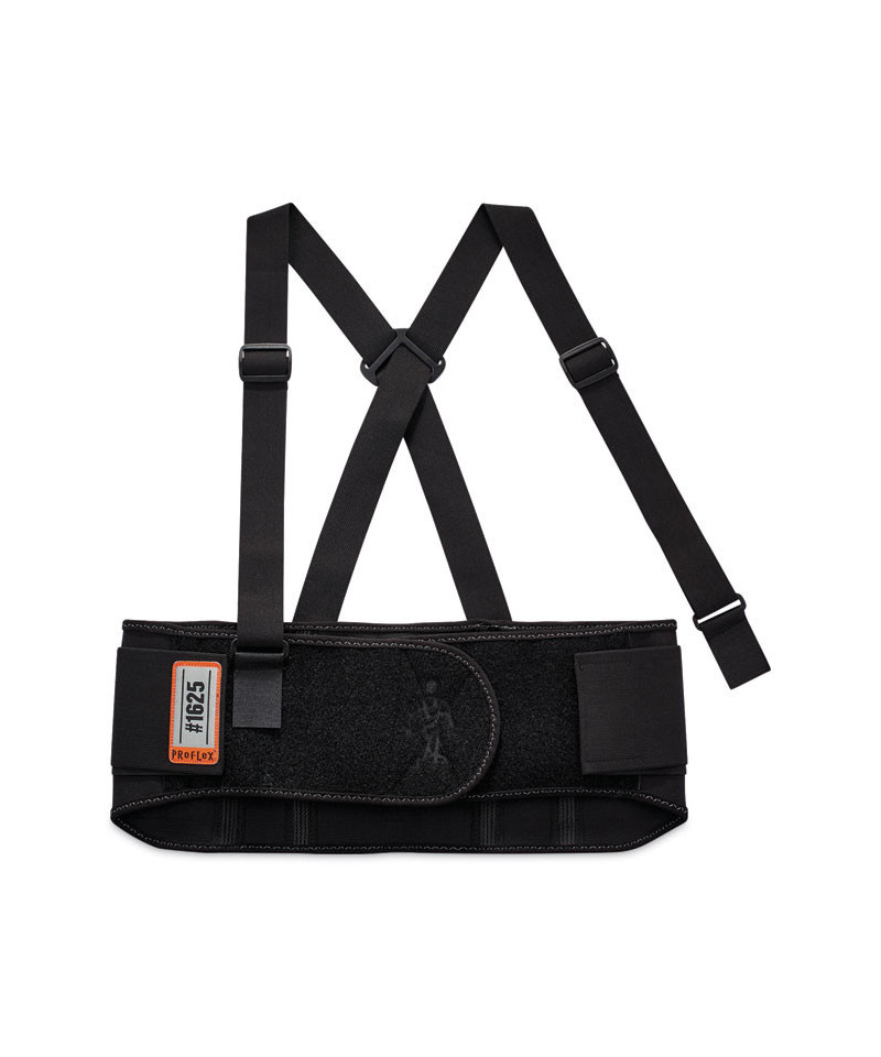 The ProFlex 1625 Standard Elastic Back Support Brace is designed to remind workers of proper lifting techniques while also enhancing the body's intra-abdominal pressure, moving the stress away from the spine for back-pain relief. Premium, all-elastic body with a 7.5 wide belt provides extra-firm support, and a contoured, high-cut front panel delivers a more comfortable fit. Before lifting heavy objects, simply tighten the support belt to enhance the body's intra-abdominal pressure; and after lifting, just loosen the belt to achieve a wider range of motion. Secure-fit, interior rubber-track webbing prevents the belt from riding up when bending or lifting. Innovative Power Panel Positioners keep the tension bands close-to-hand, making it easy to get the desired level of tension. Non-conductive polypropylene stays help ensure long-lasting integrity. Adjustable, detachable suspenders allow the wearer to tailor the shoulder-fit to his or her unique needs. For best results, the support should fit snugly around the wearer's hips, with the front of the support two-fingers below the wearer's navel. When worn correctly, workers can easily maintain the proper posture for lifting, while achieving the extra support required to safely complete the task. Easy-to-use hook-and-loop closure keeps the belt securely fastened while in use. Brace can be worn over or underneath clothing. Machine washable—machine-wash cold and air dry.