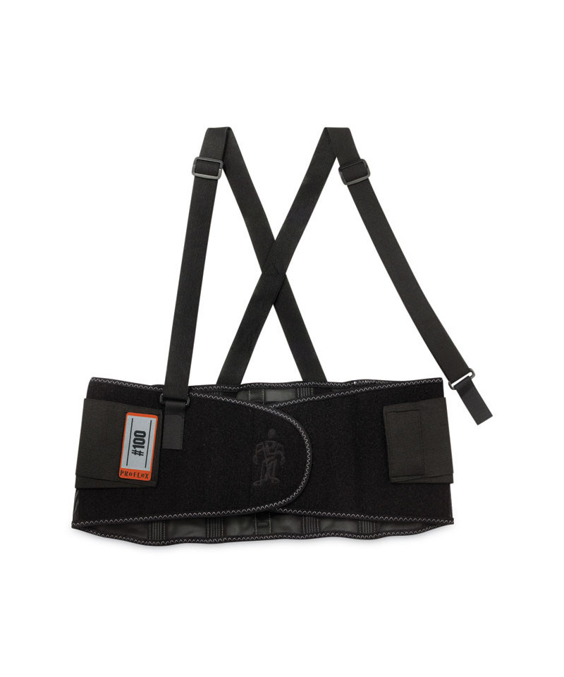 The ProFlex 100 Economy Spandex Back Support Brace is designed to remind workers of proper lifting techniques while also enhancing the body's intra-abdominal pressure, moving the stress away from the spine for back-pain relief. Durable, yet economic 280D spandex body provides reliable stretchability. Before lifting heavy objects, simply tighten the support belt to enhance the body's intra-abdominal pressure; and after lifting, just loosen the belt to achieve a wider range of motion. Secure-fit, interior rubber-track webbing prevents the belt from riding up when bending or lifting. Innovative Power Panel Positioners keep the tension bands close-to-hand, making it easy to get the desired level of tension. Non-conductive polypropylene stays help ensure long-lasting integrity. Adjustable, detachable suspenders allow the wearer to tailor the shoulder-fit to his or her unique needs. For best results, the support should fit snugly around the wearer's hips, with the front of the support two-fingers below the wearer's navel. When worn correctly, workers can easily maintain the proper posture for lifting, while achieving the extra support required to safely complete the task. Easy-to-use hook-and-loop closure keeps the belt securely fastened while in use. Brace can be worn over or underneath clothing. Machine washable—machine-wash cold and air dry.