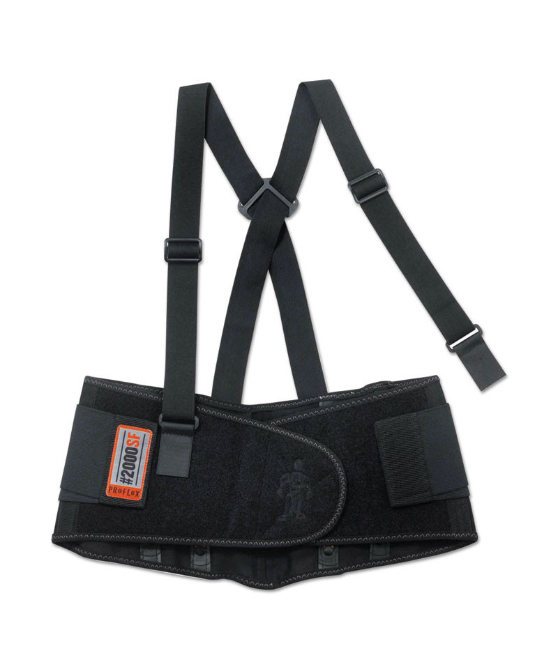 For high-performance back support, this brand's high-performance option may be tough to beat. The ProFlex 2000SF High-Performance Spandex Back Support Brace is designed to remind workers of proper lifting techniques, while enhancing the body's intra-abdominal pressure to move stress away from the spine to minimize the potential for back-pain. Comfort-stretch, premium 840D spandex body material and a unique, extra-wide, 8.5" V-shaped waistbelt ensures that the support brace works with, rather than against, the wearer throughout the toughest days, even those days where the bending, twisting, lifting and schlepping never seems to end. Ultra-flexible, stretchable bias binding features zig-zag stitching for enhanced strength. Before lifting heavy objects, simply tighten the support belt to enhance the body's intra-abdominal pressure; and after lifting, just loosen the belt to achieve a wider range of motion. Innovative Power Panel Positioners keep the tension bands close-to-hand, making it easy to get the desired level of tension to meet the current task. Non-conductive Sticky Fingers stays help ensure long-lasting integrity. Adjustable, removable shoulder straps keep the belt on standby until the next lift while allowing the wearer to tailor the shoulder-fit to his or her unique needs. For best results, the support belt should fit snugly around the wearer's hips, with the front of the support two-fingers below the wearer's navel. When worn correctly, workers can easily maintain the proper posture for lifting, while achieving the extra support required to safely complete the task. Easy-to-use hook-and-loop closure keeps the belt securely fastened while in use. Brace can be worn over or underneath clothing. Machine washable—machine-wash cold and air dry.