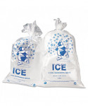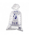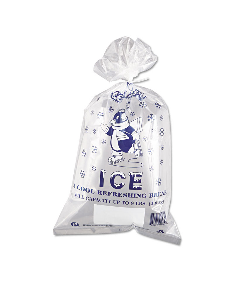 Cute "Cool Penguin" design decorates these sturdy polyethylene ice bags. Includes twist ties for easy closure. They're heavy-duty strength designed for maximum loading. Content added so bags can withstand freezing temperatures. Fill line printed on top of bags; net weight printed on bottom.