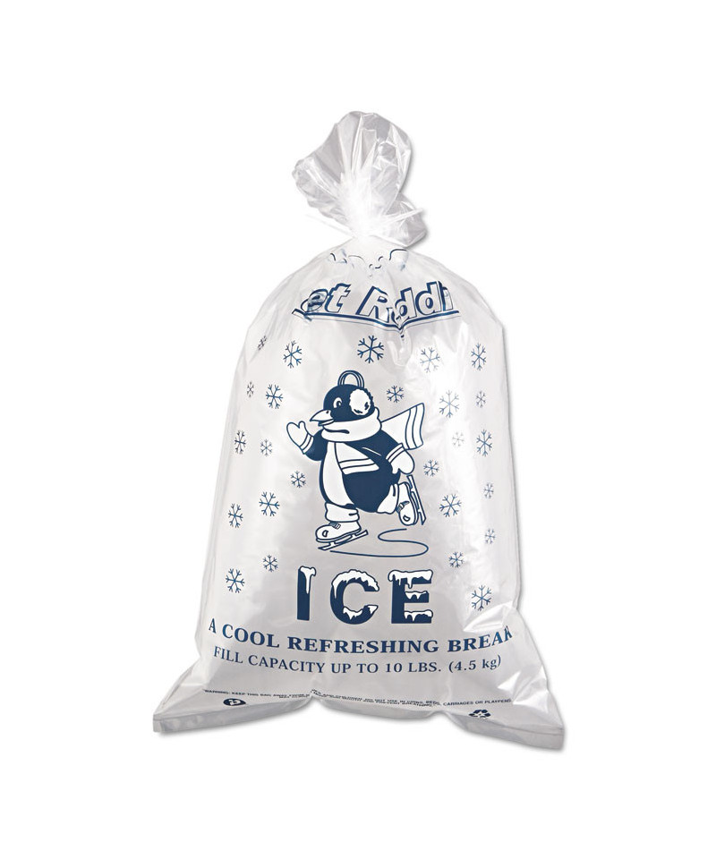 Cute "Cool Penguin" design decorates these sturdy polyethylene ice bags. Includes twist ties for easy closure. They're heavy-duty strength designed for maximum loading. Content added so bags can withstand freezing temperatures. Fill line printed on top of bags; net weight printed on bottom.