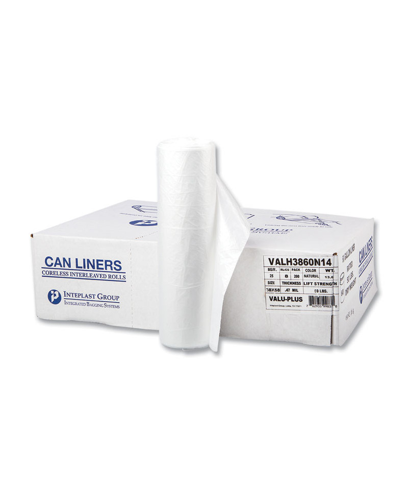 HDPE liners are an excellent choice for refuse-collection applications where there are no sharp edges. High-quality, virgin resin provides a higher-than-average tensile strength with an outstanding dart-impact rating. Strong, star-sealed bottoms ensure weight remains distributed evenly. Innovative "clamshell" box features E-Z liner-identification labeling.