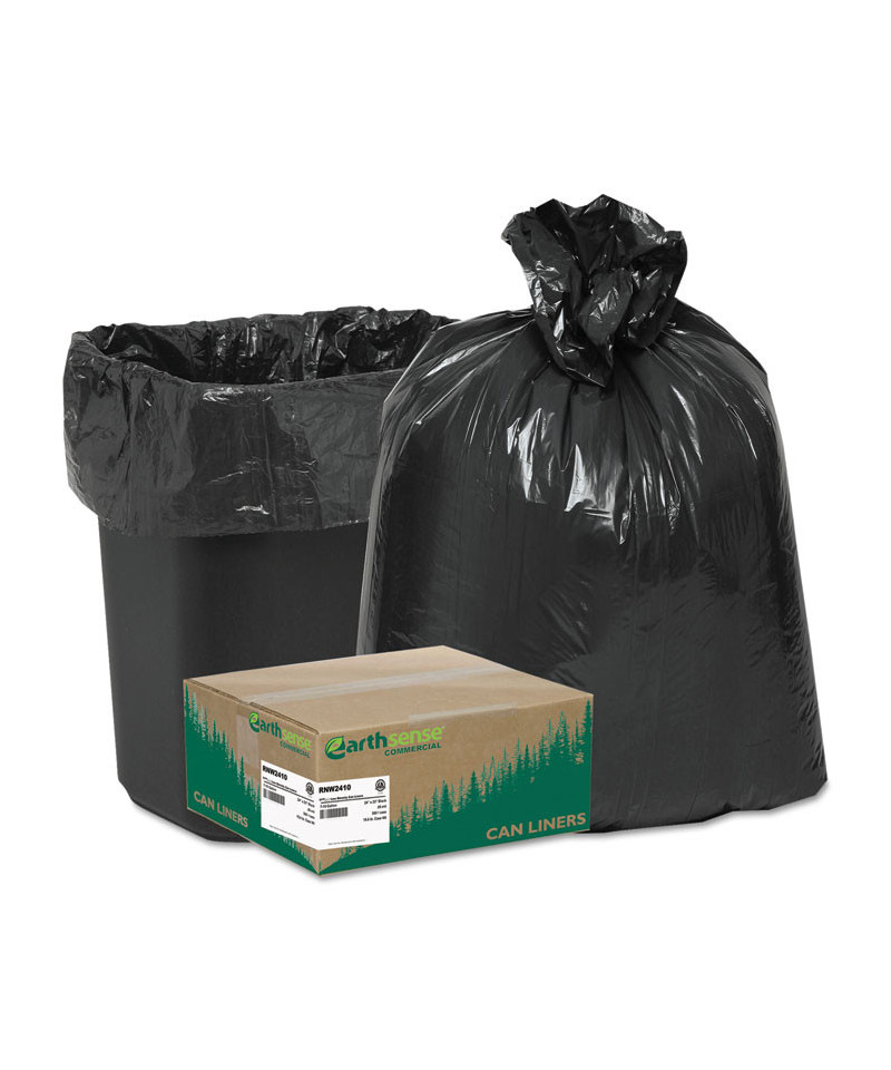 Extra heavy duty recycled liners are suitable for all trash applications. Ideal for state and local municipalities that mandate purchasing of recycled content products. Star bottom seal construction distributes weight more evenly and resists leaks. Coreless rolls for convenient dispensing. Black color hides unsightly trash.