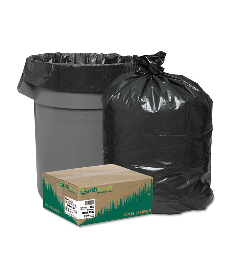 Extra heavy duty recycled liners are suitable for all trash applications. Ideal for state and local municipalities that mandate purchasing of recycled content products. Star bottom seal construction distributes weight more evenly and resists leaks. Coreless rolls for convenient dispensing. Black color hides unsightly trash.