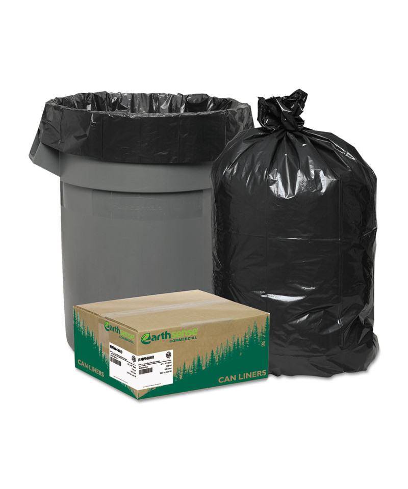 Extra heavy duty recycled liners are suitable for all trash applications. Ideal for state and local municipalities that mandate purchasing of recycled content products. Star bottom seal construction distributes weight more evenly and resists leaks. Coreless rolls for convenient dispensing. Black color hides unsightly trash.