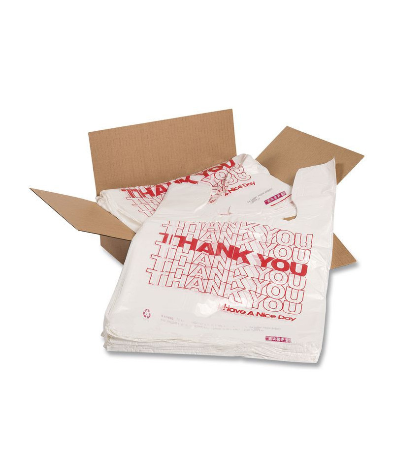 Preprinted "Thank You" shopping bags help you show appreciation while boosting your image. Strong, high-density plastic resists tearing and splitting. Convenient handles.