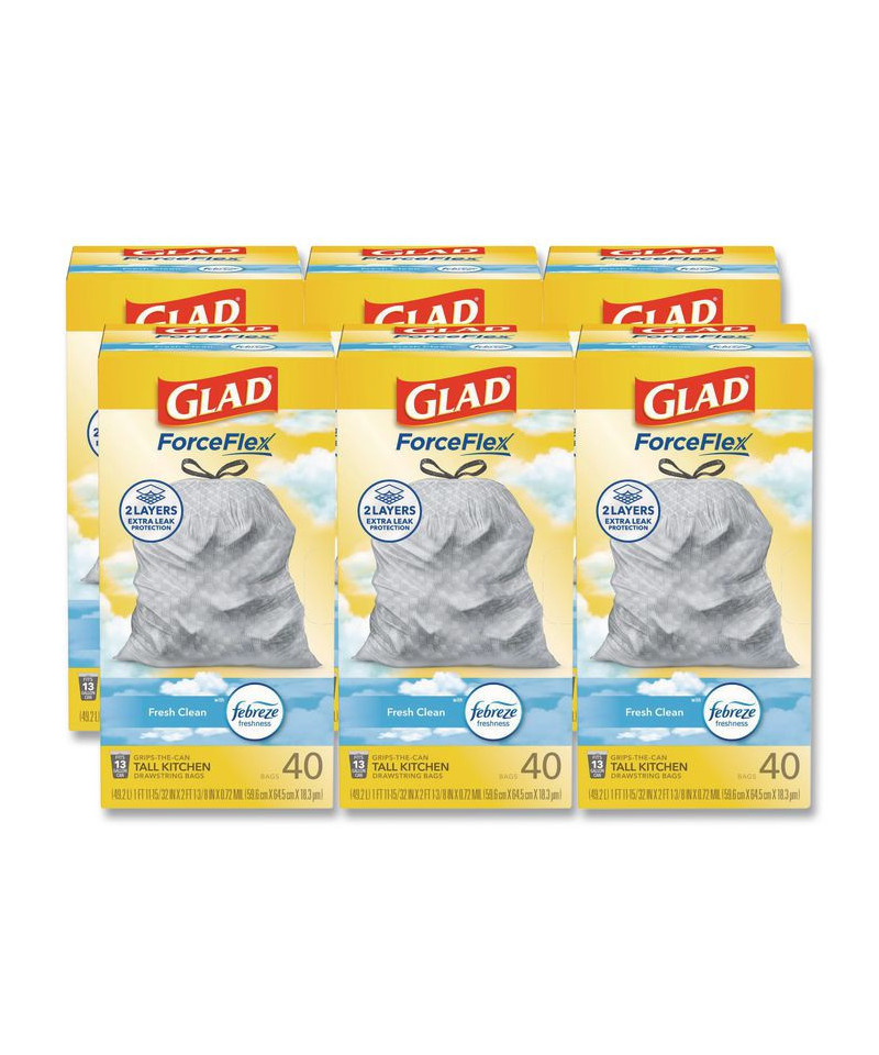 Let the stretchable strength of Glad® ForceFlex™ handle all the messes our busy daily life can throw at it and then some. Glad® Tall Kitchen Drawstring Trash Bags are designed with ForceFlex™ technology to give extra flex as it expands around sharp edges and heavy loads, so you can pack it in while resisting tears, rips and punctures. These trash bags are designed with two layers for extra leak protection. RipGuard® and LeakGuard® technology prevent seepage of liquids and keep trash contained. Fight nasty kitchen odors with the exclusive Glad® trash bag combination of steady release of Febreze freshness and irresistible scent that traps, locks and neutralizes odors. The durable Grips The Can Drawstring ensures a tight grip on the trash can to keep it in place. Take the trash to the curb with no fear of leaks and tears, and no frustration.