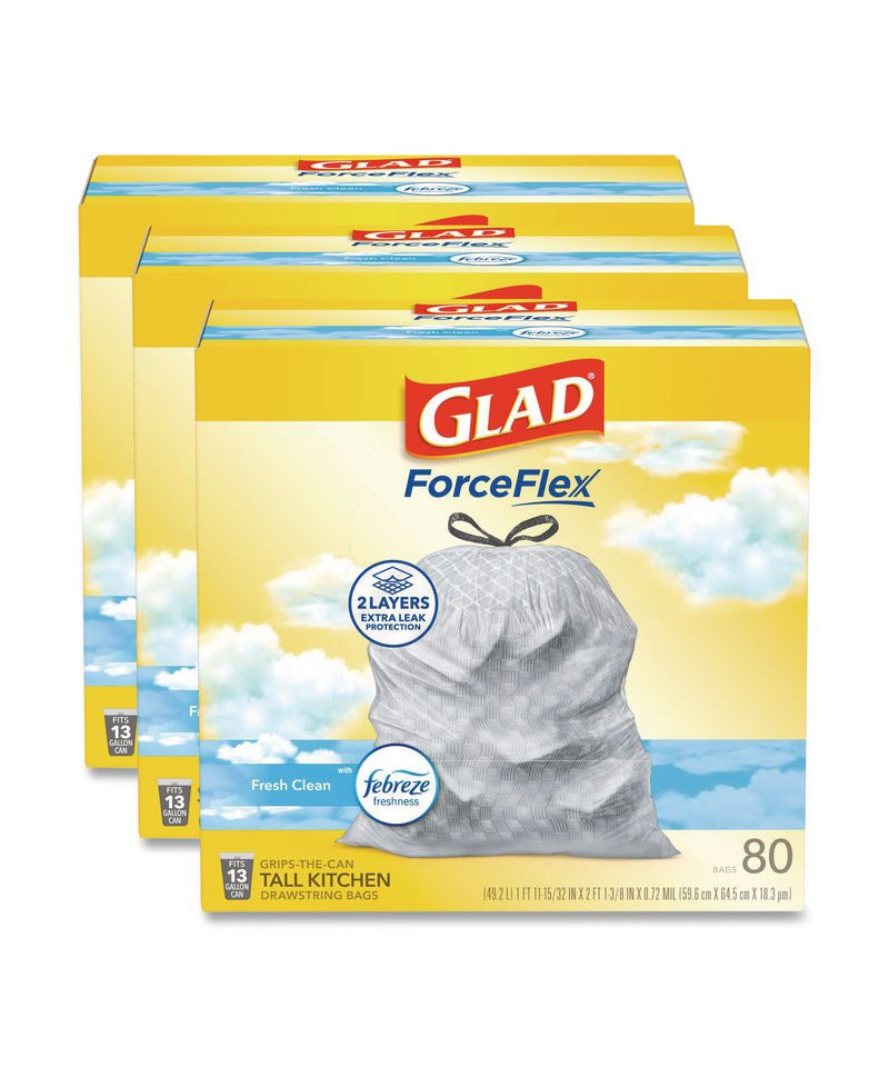 Let the stretchable strength of Glad® ForceFlex™ handle all the messes our busy daily life can throw at it and then some. Glad® Tall Kitchen Drawstring Trash Bags are designed with ForceFlex™ technology to give extra flex as it expands around sharp edges and heavy loads, so you can pack it in while resisting tears, rips and punctures. These trash bags are designed with two layers for extra leak protection. RipGuard® and LeakGuard® technology prevent seepage of liquids and keep trash contained. Fight nasty kitchen odors with the exclusive Glad® trash bag combination of steady release of Febreze freshness and irresistible scent that traps, locks and neutralizes odors. The durable Grips The Can Drawstring ensures a tight grip on the trash can to keep it in place. Take the trash to the curb with no fear of leaks and tears, and no frustration.