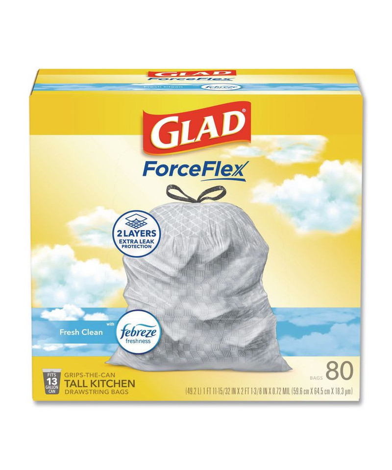 Let the stretchable strength of Glad® ForceFlex™ handle all the messes our busy daily life can throw at it and then some. Glad® Tall Kitchen Drawstring Trash Bags are designed with ForceFlex™ technology to give extra flex as it expands around sharp edges and heavy loads, so you can pack it in while resisting tears, rips and punctures. These trash bags are designed with two layers for extra leak protection. RipGuard® and LeakGuard® technology prevent seepage of liquids and keep trash contained. Fight nasty kitchen odors with the exclusive Glad® trash bag combination of steady release of Febreze freshness and irresistible scent that traps, locks and neutralizes odors. The durable Grips The Can Drawstring ensures a tight grip on the trash can to keep it in place. Take the trash to the curb with no fear of leaks and tears, and no frustration.