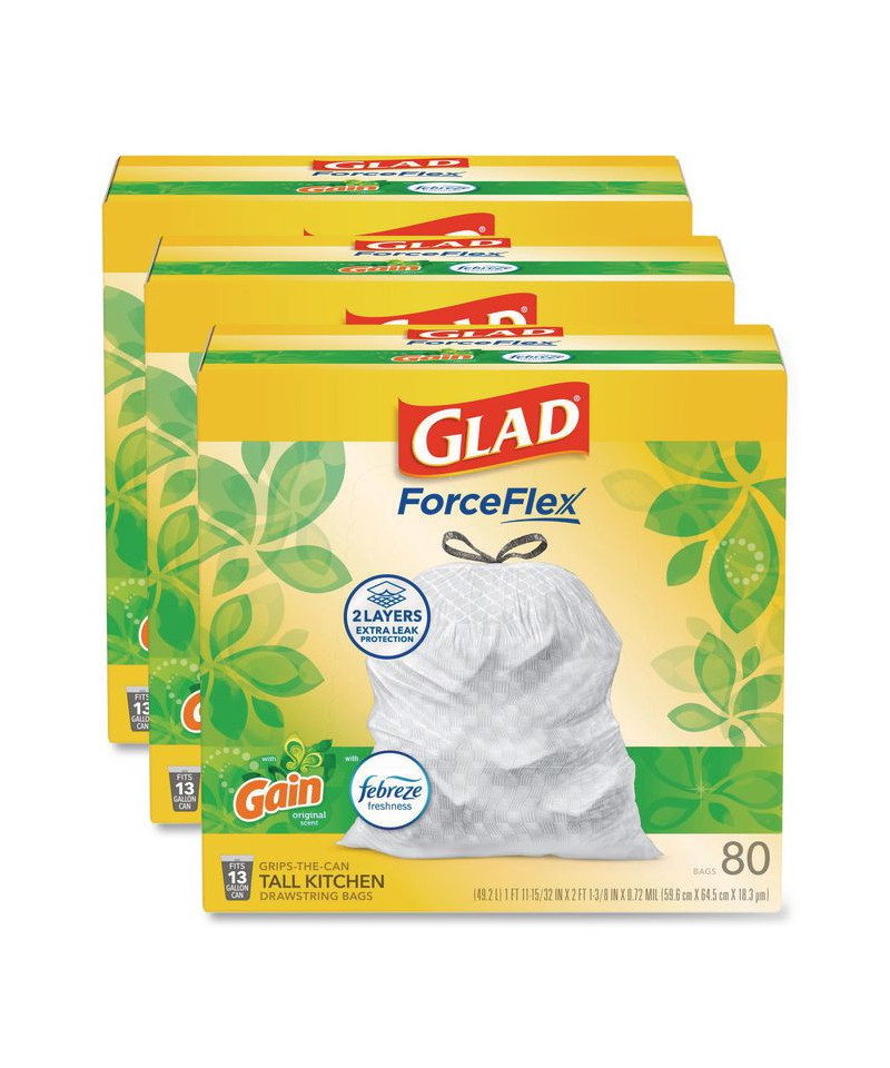 Let the stretchable strength of Glad® ForceFlex™ handle all the messes our busy daily life can throw at it and then some. Glad® Tall Kitchen Drawstring Trash Bags are designed with ForceFlex™ technology to give extra flex as it expands around sharp edges and heavy loads, so you can pack it in while resisting tears, rips and punctures. These trash bags are designed with two layers for extra leak protection. RipGuard® and LeakGuard® technology prevent seepage of liquids and keep trash contained. Fight nasty kitchen odors with the exclusive Glad® trash bag combination of steady release of Febreze freshness and irresistible scent that traps, locks and neutralizes odors. The durable Grips The Can Drawstring ensures a tight grip on the trash can to keep it in place. Take the trash to the curb with no fear of leaks and tears, and no frustration.
