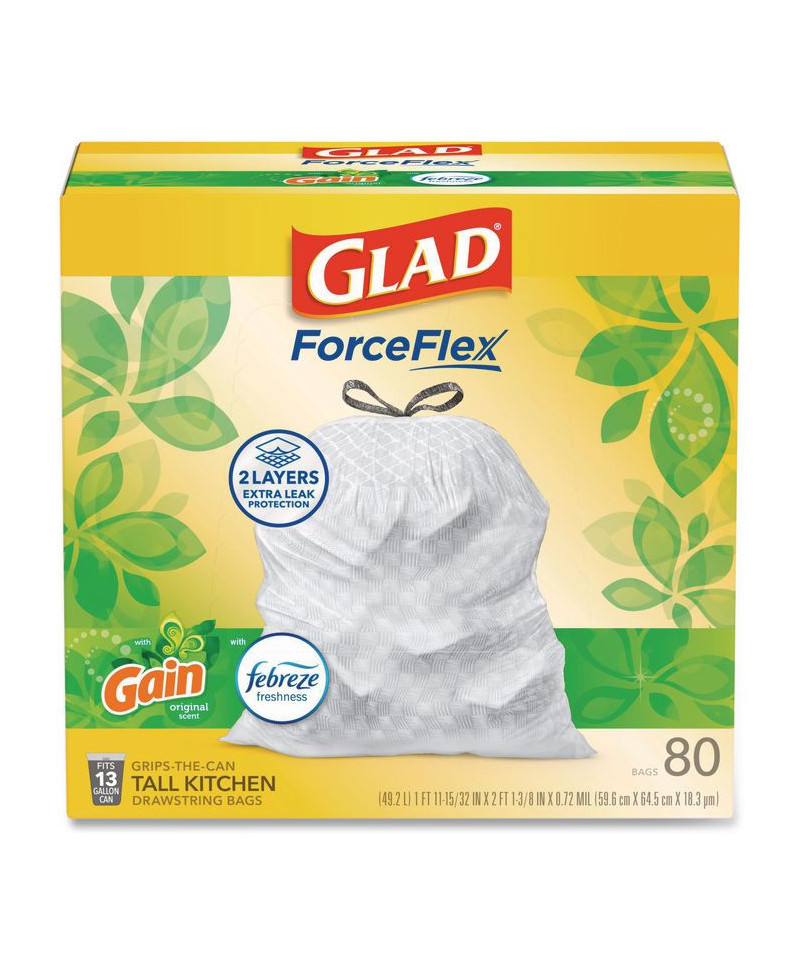 Let the stretchable strength of Glad® ForceFlex™ handle all the messes our busy daily life can throw at it and then some. Glad® Tall Kitchen Drawstring Trash Bags are designed with ForceFlex™ technology to give extra flex as it expands around sharp edges and heavy loads, so you can pack it in while resisting tears, rips and punctures. These trash bags are designed with two layers for extra leak protection. RipGuard® and LeakGuard® technology prevent seepage of liquids and keep trash contained. Fight nasty kitchen odors with the exclusive Glad® trash bag combination of steady release of Febreze freshness and irresistible scent that traps, locks and neutralizes odors. The durable Grips The Can Drawstring ensures a tight grip on the trash can to keep it in place. Take the trash to the curb with no fear of leaks and tears, and no frustration.