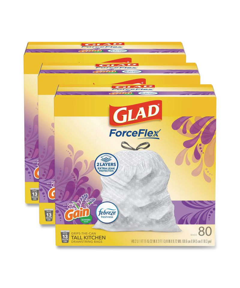 Let the stretchable strength of Glad® ForceFlex™ handle all the messes our busy daily life can throw at it and then some. Glad® Tall Kitchen Drawstring Trash Bags are designed with ForceFlex™ technology to give extra flex as it expands around sharp edges and heavy loads, so you can pack it in while resisting tears, rips and punctures. These trash bags are designed with two layers for extra leak protection. RipGuard® and LeakGuard® technology prevent seepage of liquids and keep trash contained. Fight nasty kitchen odors with the exclusive Glad® trash bag combination of steady release of Febreze freshness and irresistible scent that traps, locks and neutralizes odors. The durable Grips The Can Drawstring ensures a tight grip on the trash can to keep it in place. Take the trash to the curb with no fear of leaks and tears, and no frustration.
