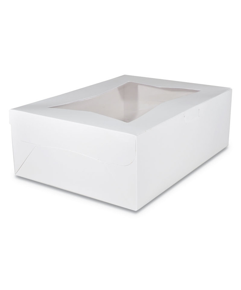 High-quality bakery boxes are perfect for cakes, pastries and pies. Clay-coated paperboard provides an interior moisture barrier and a clean, white surface for your baked goods. Locking corners ensure that your cookies and cakes arrive safely at their destination. A tuck-in top creates a secure closure. Convenient one-piece construction makes boxes easy to assemble. Clear window in lid makes it easy to put your baked goodies on display while keeping them secure.