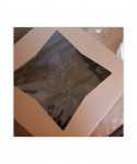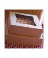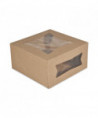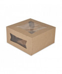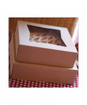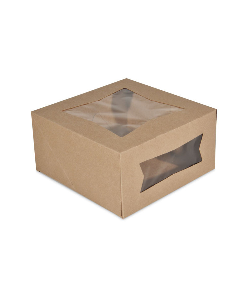 Made of Kraft, which is brown on the inside and outside, has an attached top and a cellophane window to view the box's contents, and can be used to hold and carry baked goods. Paperboard is thicker and more rigid than paper, is suitable for holding baked goods, and can be recycled - just be sure to remove the window film before placing in the bin. The attached top flips open to insert or remove baked goods. When closed, the top fully overlaps the bottom. The box has a corner beers design with glued corners for sturdiness. Diagonal scores allow the box to be folded flat for storage or transport.