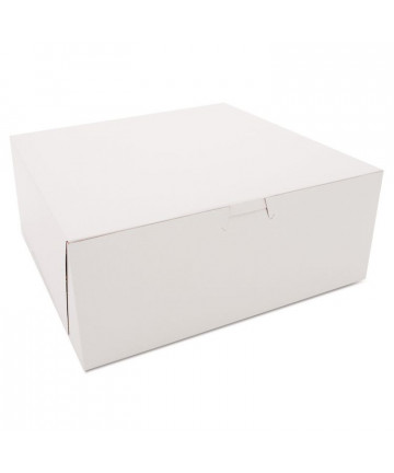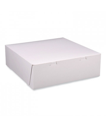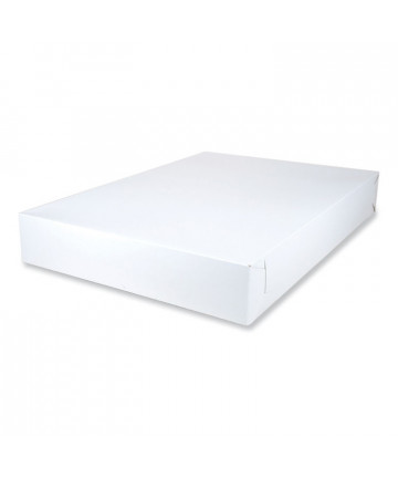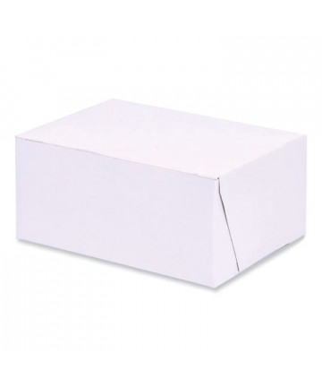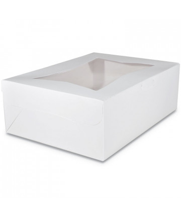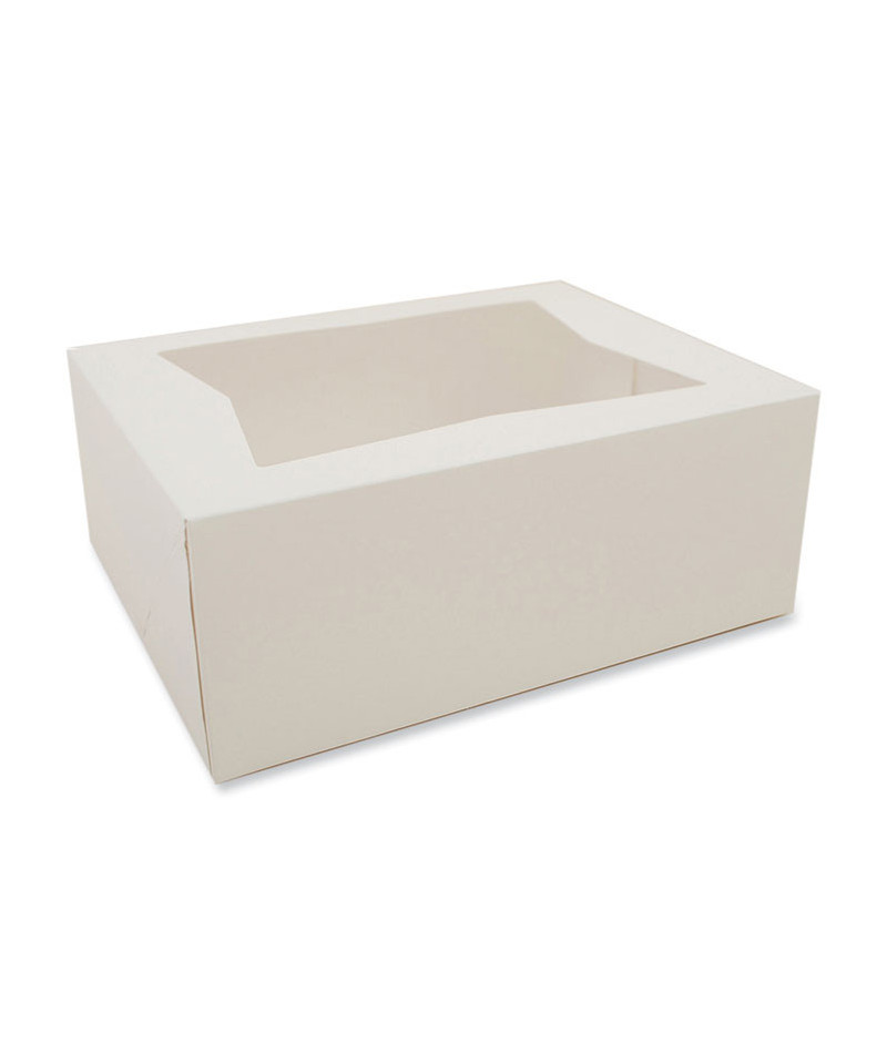 Made of SBS paperboard, which is white on the inside and outside, has an attached top, and can be used to hold and carry baked goods. White SBS (solid bleached sulfate) paperboard is thicker and more rigid than paper, is suitable for holding baked goods, and can be recycled - just be sure to remove the window film before placing in the bin. It can be printed with a logo or a business name. The attached top flips open to insert or remove baked goods. When closed, the top fully overlaps the bottom. A cellophane window provides a view of the box's contents. The box has a corner beers design with glued corners for sturdiness. Diagonal scores allow the box to be folded flat for storage or transport.