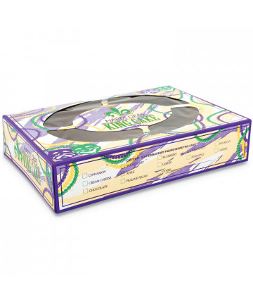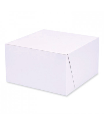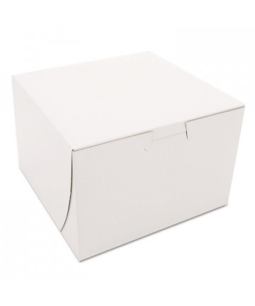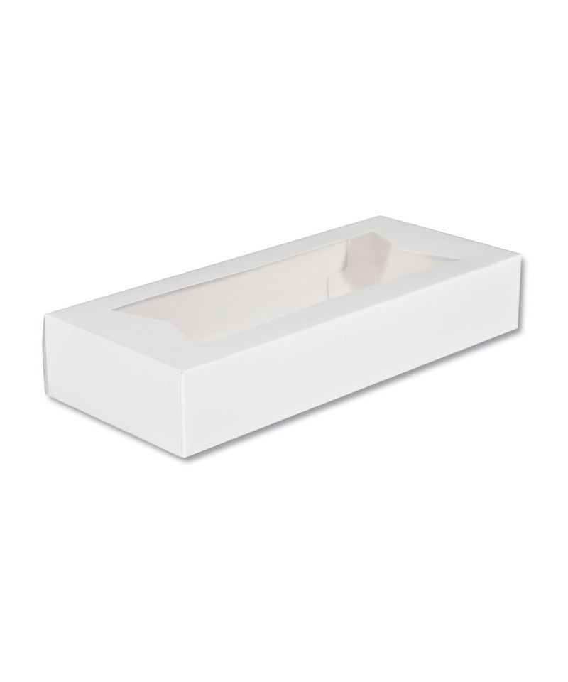 Made of SBS paperboard, which is white on the inside and outside, has an attached top, and can be used to hold and carry baked goods. White SBS (solid bleached sulfate) paperboard is thicker and more rigid than paper, is suitable for holding baked goods, and can be recycled - just be sure to remove the window film before placing in the bin. It can be printed with a logo or a business name. The attached top flips open to insert or remove baked goods. When closed, the top fully overlaps the bottom. A cellophane window provides a view of the box's contents. The box has a corner beers design with glued corners for sturdiness. Diagonal scores allow the box to be folded flat for storage or transport.