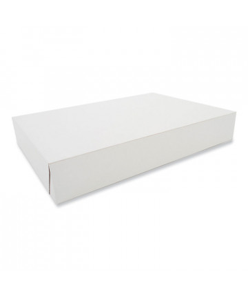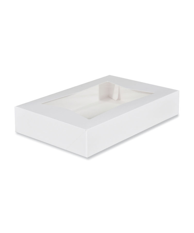 Made of SBS paperboard, which is white on the inside and outside, has an attached top, and can be used to hold and carry baked goods. White SBS (solid bleached sulfate) paperboard is thicker and more rigid than paper, is suitable for holding baked goods, and can be recycled - just be sure to remove the window film before placing in the bin. It can be printed with a logo or a business name. The attached top flips open to insert or remove baked goods. When closed, the top fully overlaps the bottom. A cellophane window provides a view of the box's contents. The box has a corner beers design with glued corners for sturdiness. Diagonal scores allow the box to be folded flat for storage or transport.