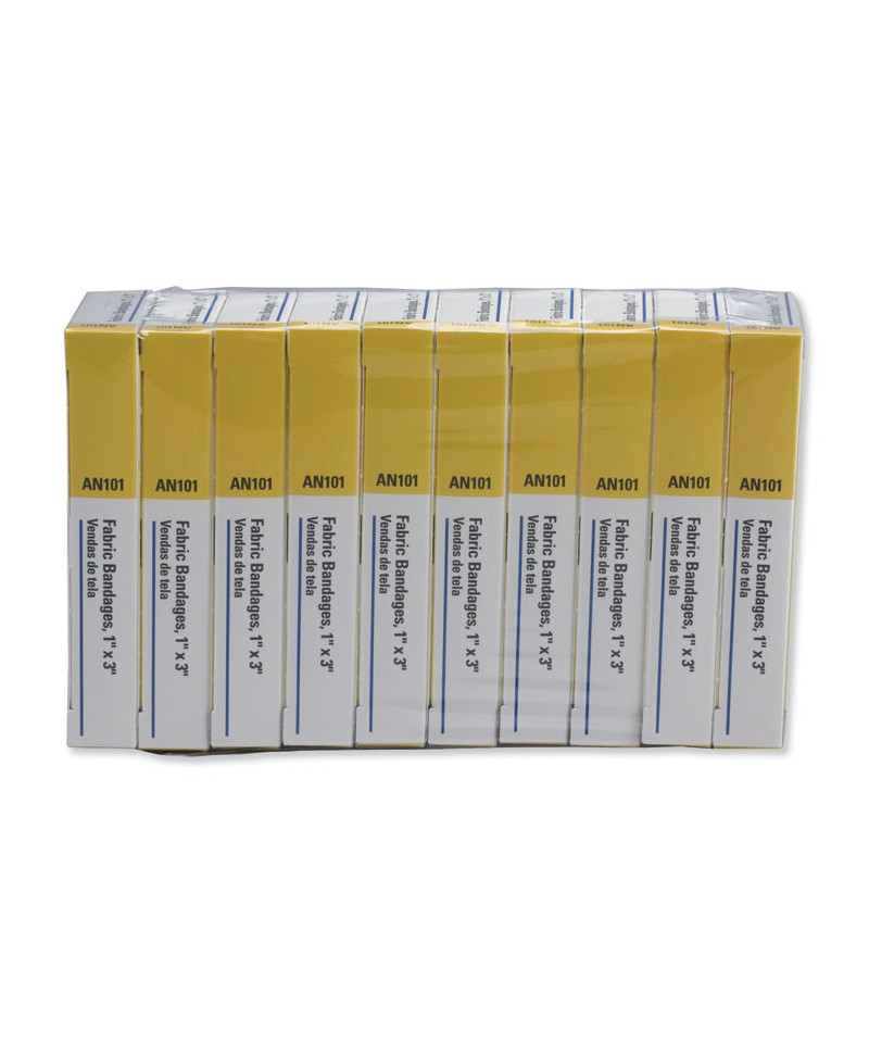Add to cart First Aid Fabric Bandages, 1" x 3", 50/Box $6.88 Assortment of bandages for cuts and abrasions in the workplace or home.