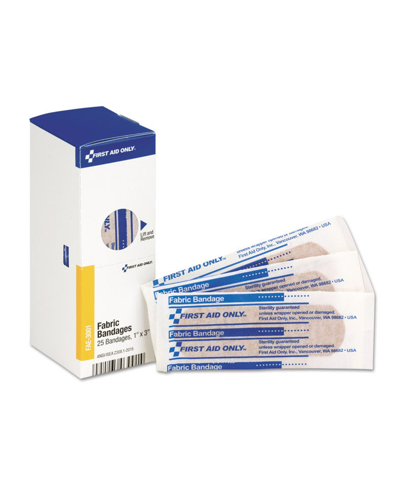 Add to cart First Aid Fabric Bandages, 1" x 3", 50/Box $6.88 Assortment of bandages for cuts and abrasions in the workplace or home.