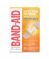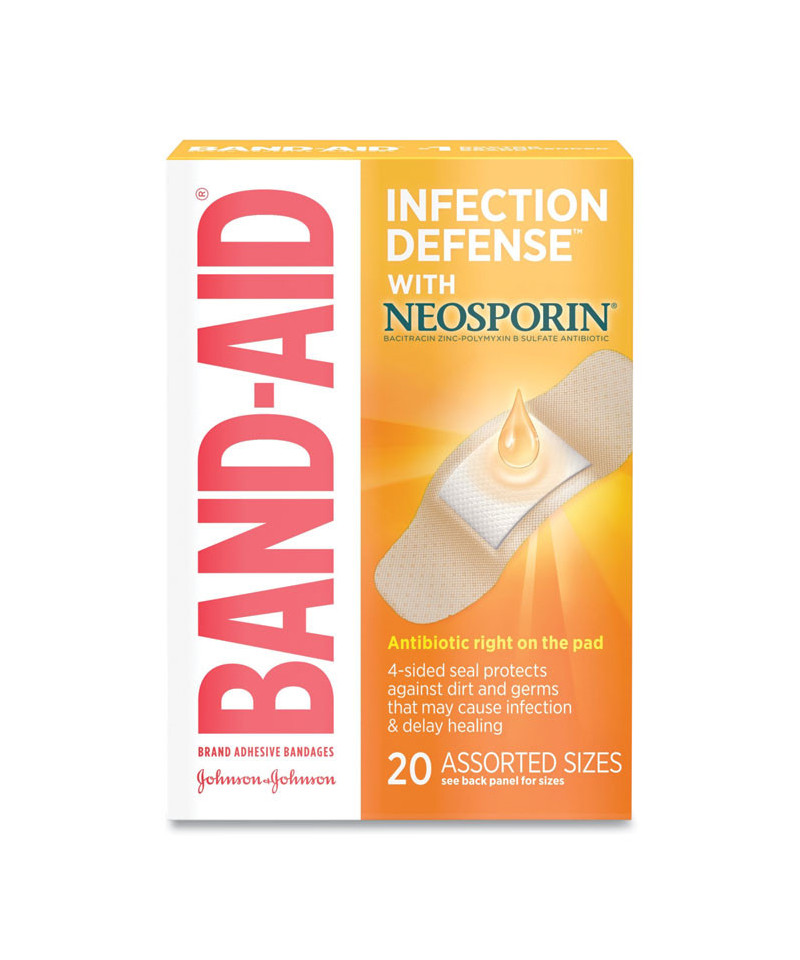 Get mess-free infection protection with Band-Aid Brand Adhesive Bandages Infection Defense with Neosporin. In assorted sizes, these sterile bandages have Neosporin antibiotic ointment right on the pad, and provide a 4-sided seal that protects against dirt and germs that may cause infection and delay healing. These Band-Aid Brand Adhesive Bandages also have a Hurt-Free Pad that won't stick to the wound, allowing for gentle removal. This package contains antibiotic bandages in a variety of sizes.