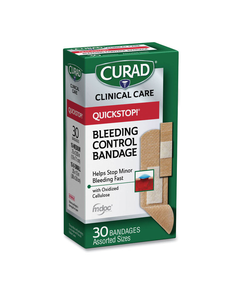 New QuickStop!™ bandages incorporate an m-doc® Active to stop bleeding fast. The naturally derived blood stopping agent is the ideal option for persistent or recurring bleeding wounds. Non-stick pad prevents sticking to wound site. Includes cellulose, a natural blood clotting wound agent. Sterile unless package is damaged or open. These bandages are your go-to option for a quick fix to any minor scrapes or cuts. Not made with Natural Rubber Latex.
