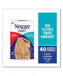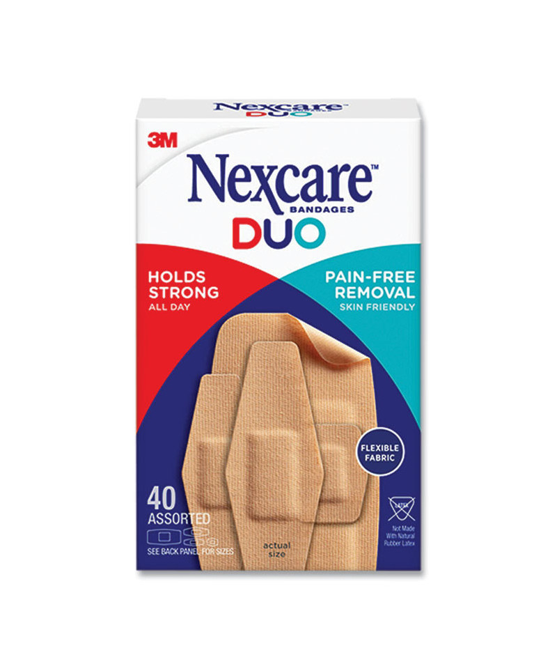With 3M Nexcare™ Duo Bandages you no longer have to compromise between pain-free removal or a bandage that stays in place until you're ready to remove it. Flexible fabric strips conform to skin stretching, bending and flexing to move with you, while pad cushions the wound. 360-degree seal around pad covers and protects minor wounds. Keep your first aid kit stocked with Nexcare™ Duo Bandages. Long lasting adhesive allows for wear up to 24 hours, but is gentle enough to allow for easy removal, leaving no gunk.