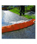 Portable self-rising barrier that contains and controls flood water. Simply roll out in desired location and watch it rise with the flow of oncoming water.