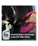 Quickly removes tough surface mold and mildew stains on a wide variety of surfaces using a bleach-free formula. The foam sprayer prevents splash-back and spores from spreading in the air. Certified EPA's Safer Choice for safer chemistry. Perfect for use on painted walls, ceramic tiles, hardwood floors and baseboards, fabrics, glass, metals, concrete, siding, and countertops.