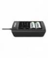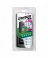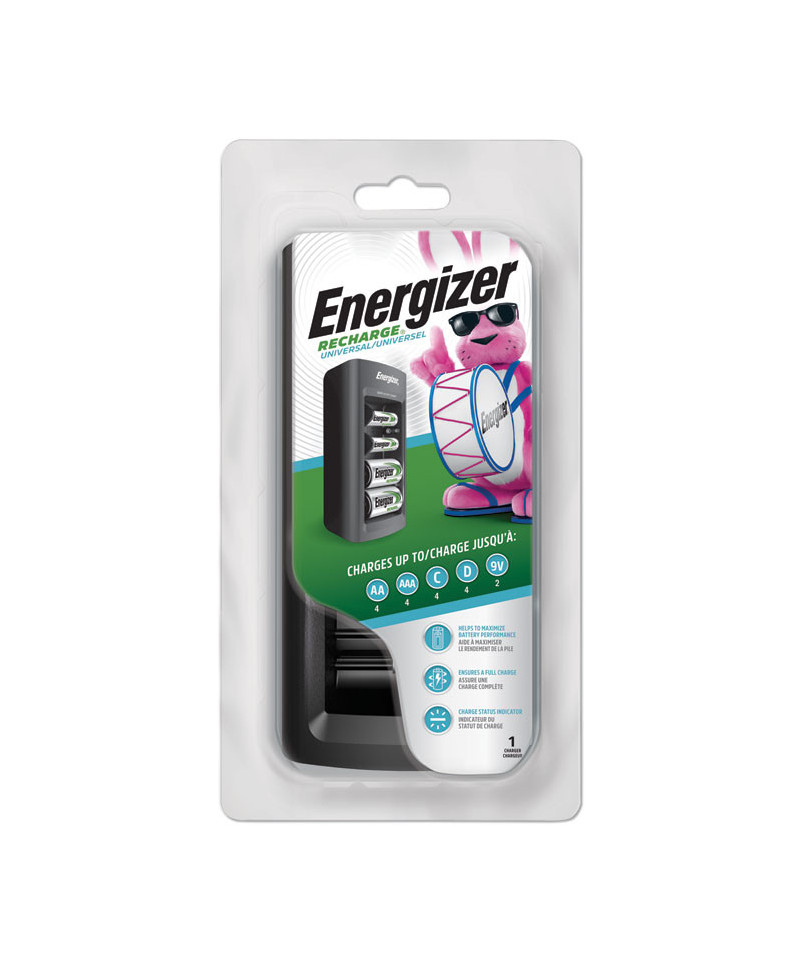 The easy way to keep all your rechargeable batteries juiced. The Energizer Universal Charger is designed for range, charging standard rechargeable battery sizes big and small-from AAA to 9V NiMH-without the need for multiple charging devices. Its LED light bar status indicator updates you in real time when charging is complete. Helps maximize battery performance; this charger automatically shuts power off to the circuit once it detects batteries are fully charged. With a multitude of safety features, like bad and primary battery detection, reverse polarity protection, and a timer that prevents overcharging-you get a reliable and worry-free charge time after time. So whenever a device runs out of juice, from game controllers to TV remotes to flashlights and toys, know you can trust the long-lasting performance and intuitive charging power of Energizer Recharge. Charges: 2 or 4 AAA, AA, C, or D, or 1 or 2 9 Volt. Compatible with all NiMH rechargeable batteries.