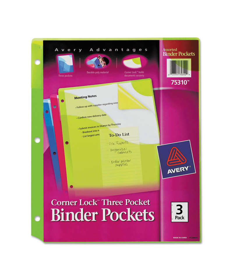 Three pockets in one! Corner Lock™ tab design secures documents in the folder. Three durable, translucent pockets keep binders neatly organized. Ideal for long-term storage, non-stick polypropylene is acid-free and won't lift print. Each pocket holds up to 20 sheets of 8 1/2 x 11 paper and fits in standard three-ring binders.