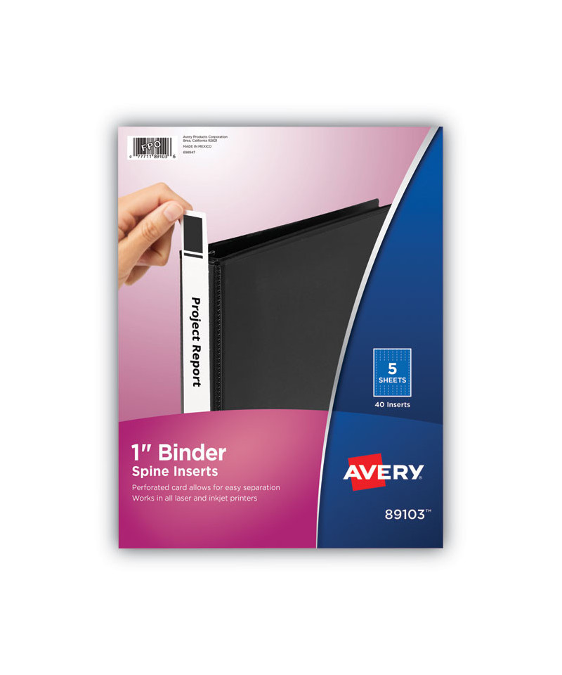 Create professional-looking spines with binder spine inserts using free templates from Avery Design & Print. Perforated cardstock allows for easy separation. Firm cardstock makes it even easier to insert each spine into a binder. 8.5" x 11" sheets for laser and inkjet printers.