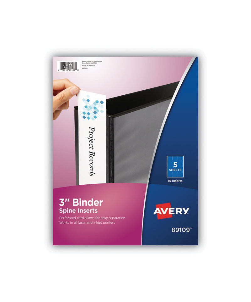Create professional-looking spines with binder spine inserts using free templates from Avery Design & Print. Perforated cardstock allows for easy separation. Firm cardstock makes it even easier to insert each spine into a binder. 8.5" x 11" sheets for laser and inkjet printers.