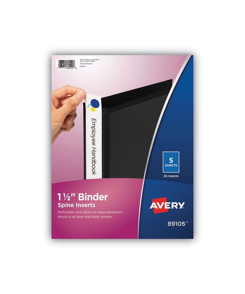 Show off the spine of a champion with binder spine inserts for three ring binders. Customization is a snap with free templates, fonts and designs on the Avery® site. Print completed spine inserts on a laser or inkjet printer. Microperforated sheets of cardstock separate easily and have smooth clean edges. Sturdy cardstock makes them easier to insert into the view binder spine. Use label binder spines for meetings, clients, personal reference or any of a host of other uses. Spine ID inserts are perfect for organizing binders at home, school or work.