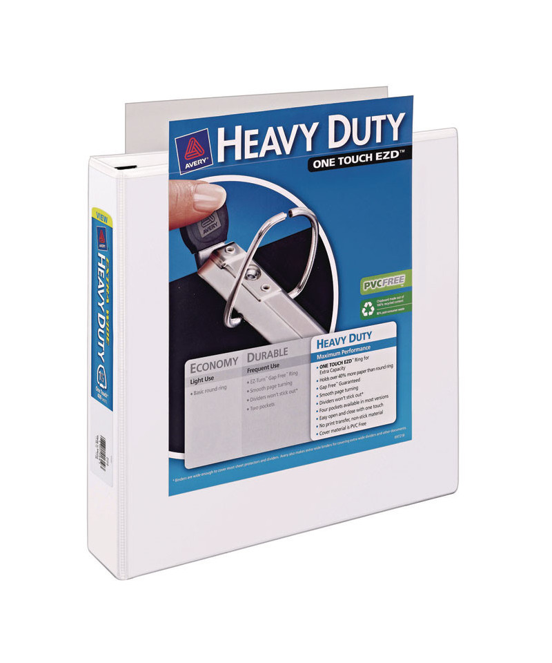 Heavy-Duty view binder with one touch EZD rings is perfect for long-term, regular use. Tear-resistant DuraHinge design is stronger and lasts longer. DuraEdge feature makes the sides and top more pliable, providing greater split resistance. Deep-textured film offers a smoother finish and features a linen pattern for a high-quality look and feel. Clear cover and spine for easy customization. Four clear, interior pockets provide extra storage space. Wider front and back panels fully cover standard dividers and sheet protectors. One touch EZD rings provide easy access and have a higher page capacity when compared to the same size round rings. Customize the cover with free, easy-to-use templates and designs at Avery Design & Print online.