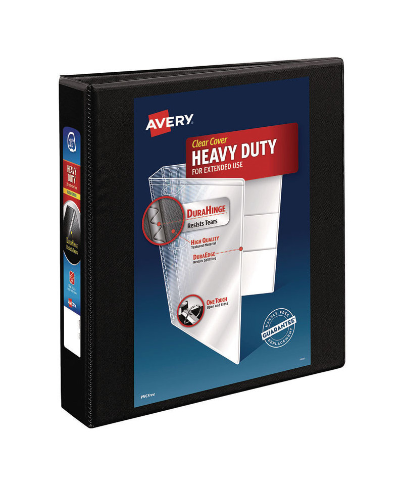 With this Heavy-Duty Nonstick View Binder you get one-touch operation and the durability required for everyday use. Nonstick material won't lift ink or toner off printed pages. Tear-resistant DuraHinge® design is stronger and lasts longer. DuraEdge® feature makes the sides and top more pliable, providing greater split resistance. Deeply textured film offers a smoother finish and features a linen pattern for a high-quality look and feel. Four clear, interior pockets provide extra storage space. Wider front and back panels fully cover standard dividers and sheet protectors. Slant rings have a higher page capacity when compared to the same size round rings. Pages lie flat with back-mounted rings (exposed rivets on back). Customize your title page using free templates and designs at Avery® Design & Print Online.