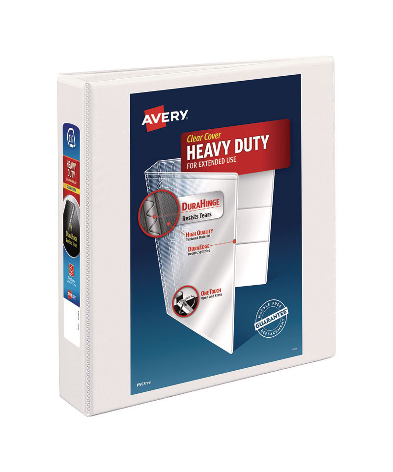 With this Heavy-Duty Nonstick View Binder you get one-touch operation and the durability required for everyday use. Nonstick material won't lift ink or toner off printed pages. Tear-resistant DuraHinge® design is stronger and lasts longer. DuraEdge® feature makes the sides and top more pliable, providing greater split resistance. Deeply textured film offers a smoother finish and features a linen pattern for a high-quality look and feel. Four clear, interior pockets provide extra storage space. Wider front and back panels fully cover standard dividers and sheet protectors. Slant rings have a higher page capacity when compared to the same size round rings. Pages lie flat with back-mounted rings (exposed rivets on back). Customize your title page using free templates and designs at Avery® Design & Print Online.