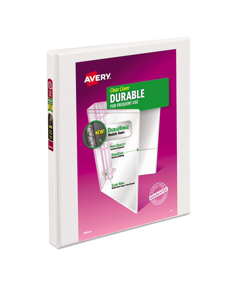 Keep lecture notes, procedures and homework assignments organized with an Avery® Durable View Binder. The durable construction is ideal for frequent referencing. The DuraHinge® design is stronger, lasts longer and resists tearing, and the DuraEdge® feature makes the sides and top more pliable, providing greater split resistance. Deeply textured film offers a smoother finish and features a linen pattern for a high-quality look and feel. Two interior pockets help you organize and secure loose papers, and the slant rings hold a higher page capacity compared to same size round rings. Use the clear overlays to label and/or decorate the covers and spine. Customize your binder more easily and more creatively with free templates and designs at Avery® Design & Print Online.