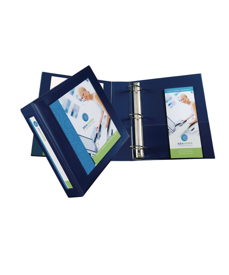 Border on front panel frames and centers title page for a professional look. Easily customize cover and spine using free designs and templates from Avery® Design & Print. Easily insert title page and spine ID with convenient mounting sheets. Two clear interior pockets and a business card pocket add to the professional image. Wider front and back panels fully cover standard dividers and sheet protectors. Pages lie flat with back-mounted rings (exposed rivets on back).
