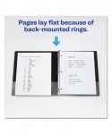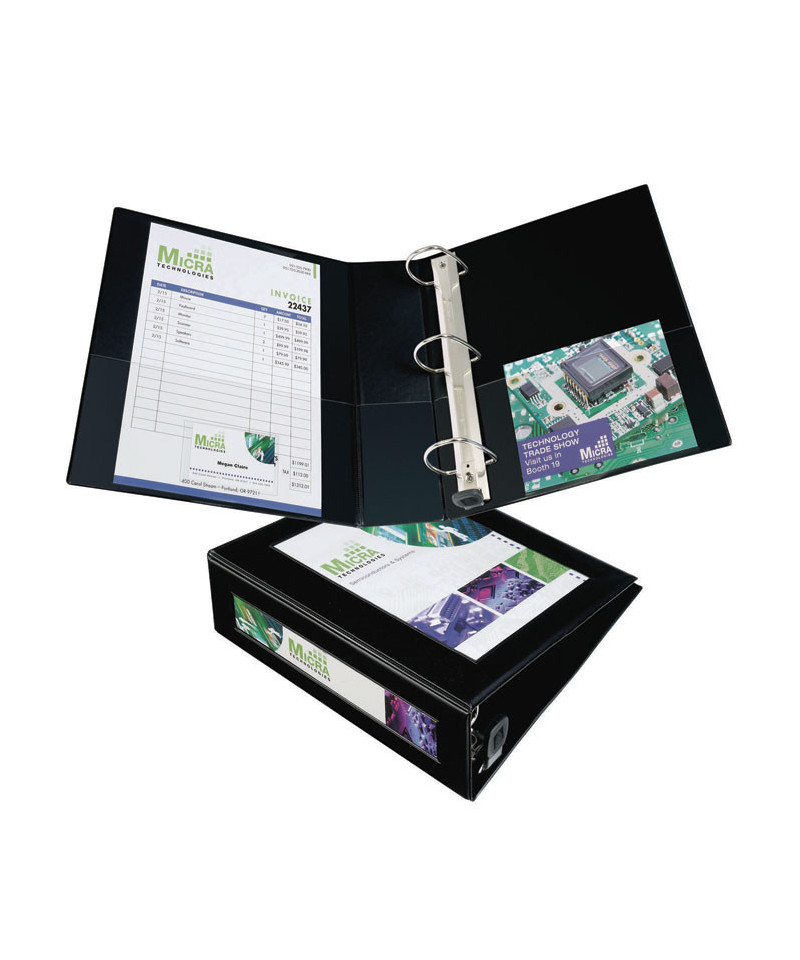 Border on front panel frames and centers title page for a professional look. Easily customize cover and spine using free designs and templates from Avery® Design & Print. Easily insert title page and spine ID with convenient mounting sheets. Two clear interior pockets and a business card pocket add to the professional image. Wider front and back panels fully cover standard dividers and sheet protectors. Pages lie flat with back-mounted rings (exposed rivets on back).