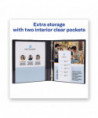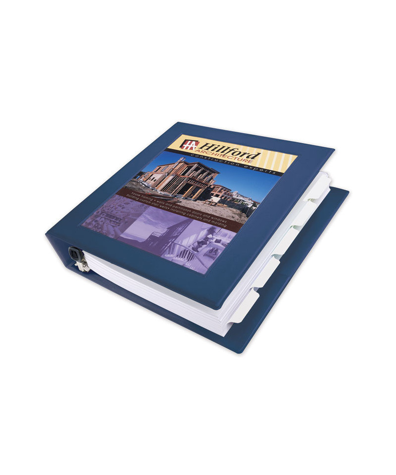 Border on front panel frames and centers title page for a professional look. Easily customize cover and spine using free designs and templates from Avery® Design & Print. Easily insert title page and spine ID with convenient mounting sheets. Two clear interior pockets and a business card pocket add to the professional image. Wider front and back panels fully cover standard dividers and sheet protectors. Pages lie flat with back-mounted rings (exposed rivets on back).