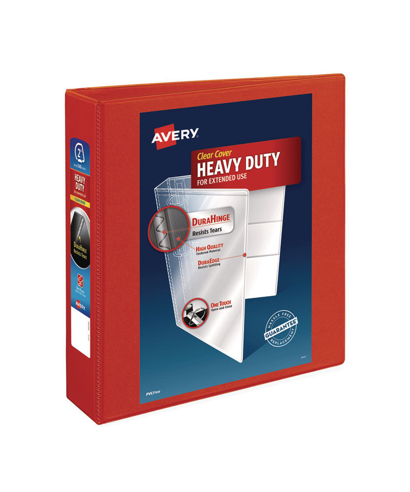 Heavy-Duty view binder with one touch EZD rings is perfect for long-term, regular use. Tear-resistant DuraHinge design is stronger and lasts longer. DuraEdge feature makes the sides and top more pliable, providing greater split resistance. Deep-textured film offers a smoother finish and features a linen pattern for a high-quality look and feel. Clear cover and spine for easy customization. Four clear, interior pockets provide extra storage space. Wider front and back panels fully cover standard dividers and sheet protectors. One touch EZD rings provide easy access and have a higher page capacity when compared to the same size round rings. Customize the cover with free, easy-to-use templates and designs at Avery Design & Print online.