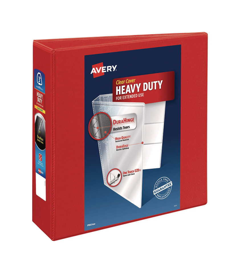 Heavy-Duty view binder with one touch EZD rings is perfect for long-term, regular use. Tear-resistant DuraHinge design is stronger and lasts longer. DuraEdge feature makes the sides and top more pliable, providing greater split resistance. Deep-textured film offers a smoother finish and features a linen pattern for a high-quality look and feel. Clear cover and spine for easy customization. Four clear, interior pockets provide extra storage space. Wider front and back panels fully cover standard dividers and sheet protectors. One touch EZD rings provide easy access and have a higher page capacity when compared to the same size round rings. Customize the cover with free, easy-to-use templates and designs at Avery Design & Print online.