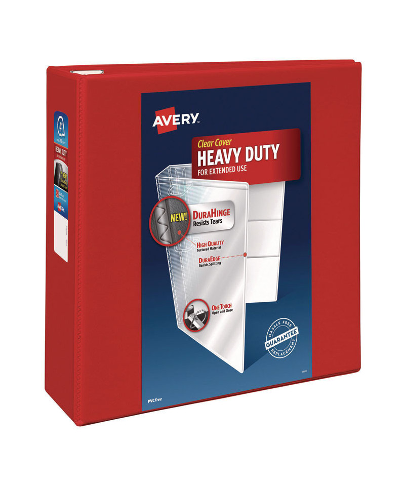 Heavy-Duty view binder with one touch EZD rings is perfect for long-term, regular use. Tear-resistant DuraHinge design is stronger and lasts longer. DuraEdge feature makes the sides and top more pliable, providing greater split resistance. Deep-textured film offers a smoother finish and features a linen pattern for a high-quality look and feel. Clear cover and spine for easy customization. Four clear, interior pockets provide extra storage space. Wider front and back panels fully cover standard dividers and sheet protectors. One touch EZD rings provide easy access and have a higher page capacity when compared to the same size round rings. Customize the cover with free, easy-to-use templates and designs at Avery Design & Print online.