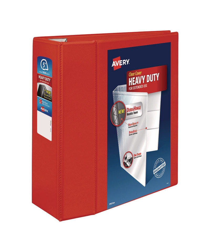 Heavy-Duty view binder with one touch EZD rings is perfect for long-term, regular use. Tear-resistant DuraHinge design is stronger and lasts longer. DuraEdge feature makes the sides and top more pliable, providing greater split resistance. Deep-textured film offers a smoother finish and features a linen pattern for a high-quality look and feel. Clear cover and spine for easy customization. Four clear, interior pockets provide extra storage space. Wider front and back panels fully cover standard dividers and sheet protectors. One touch EZD rings provide easy access and have a higher page capacity when compared to the same size round rings. Customize the cover with free, easy-to-use templates and designs at Avery Design & Print online.