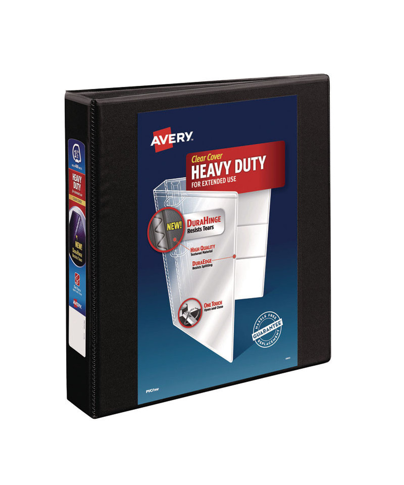 Heavy-Duty view binder with one touch EZD rings is perfect for long-term, regular use. Tear-resistant DuraHinge design is stronger and lasts longer. DuraEdge feature makes the sides and top more pliable, providing greater split resistance. Deep-textured film offers a smoother finish and features a linen pattern for a high-quality look and feel. Clear cover and spine for easy customization. Four clear, interior pockets provide extra storage space. Wider front and back panels fully cover standard dividers and sheet protectors. One touch EZD rings provide easy access and have a higher page capacity when compared to the same size round rings. Customize the cover with free, easy-to-use templates and designs at Avery Design & Print online.