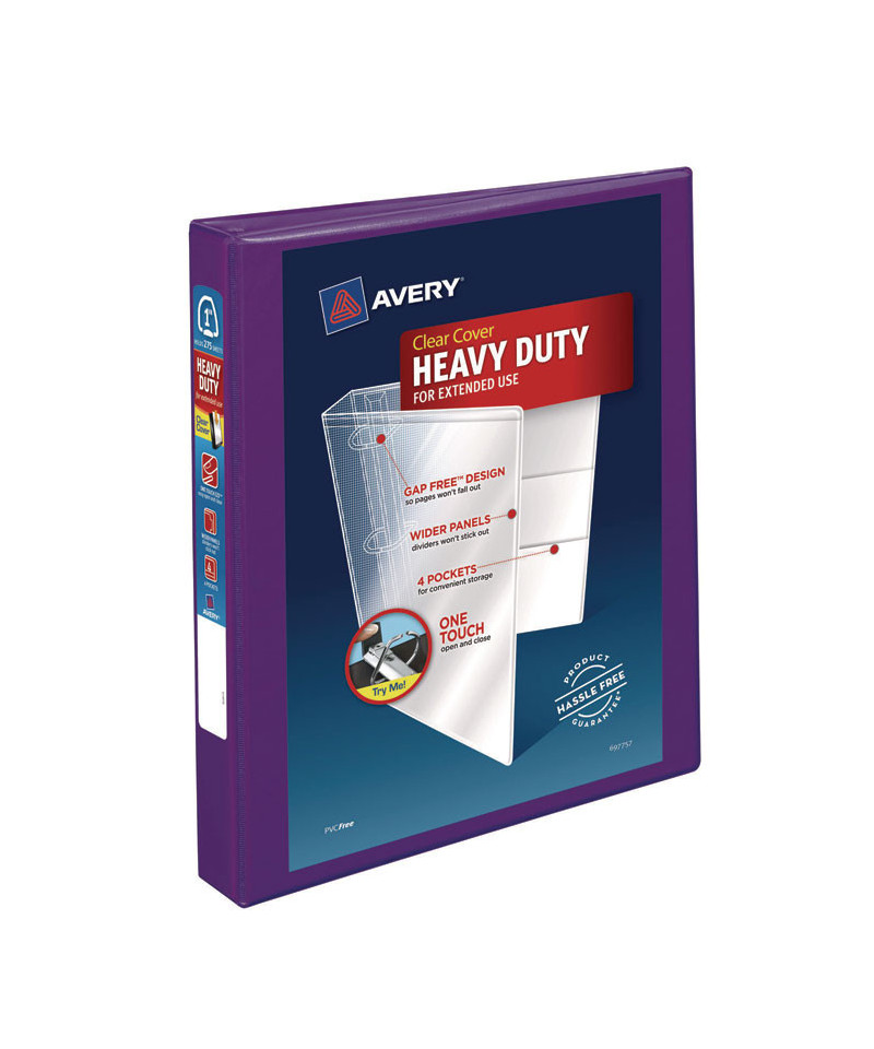 Heavy-Duty view binder with one touch EZD rings is perfect for long-term, regular use. Tear-resistant DuraHinge design is stronger and lasts longer. DuraEdge feature makes the sides and top more pliable, providing greater split resistance. Deep-textured film offers a smoother finish and features a linen pattern for a high-quality look and feel. Clear cover and spine for easy customization. Four clear, interior pockets provide extra storage space. Wider front and back panels fully cover standard dividers and sheet protectors. One touch EZD rings provide easy access and have a higher page capacity when compared to the same size round rings. Customize the cover with free, easy-to-use templates and designs at Avery Design & Print online.